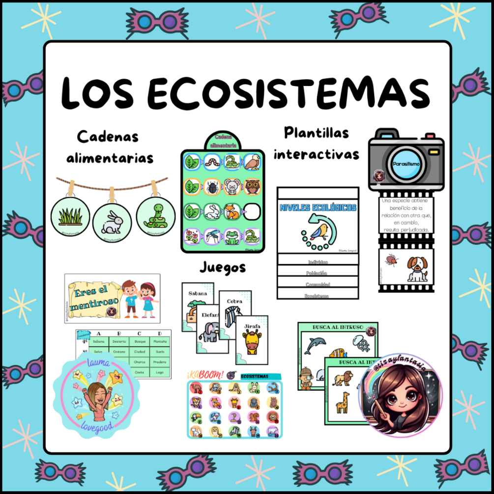 Incluye foldables sobre los niveles ecológicos y las relaciones interespecificas que se dan en los ecosistemas; así como actividades divertidas y juegos sobre las cadenas alimentarias y los seres vivos que pertenecen a un ecosistema.